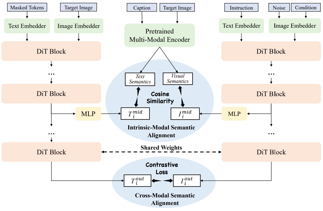 扩散模型在文本生成图像任务上的显著成功,激发了将其能力扩展至多模态任务(包括图像理解、编辑和感知等)的广泛兴趣。这类任务要求模型具备跨视觉与文本模态的高级语义理解能力,尤其是在涉及复杂语义指令的场景中。然而,现有方法往往高度依赖视觉-语言模型(VLMs)或模块化设计进行语义引导,导致架构碎片化和计算效率低下。为应对这些挑战,我们提出了UniAlignment——一种基于单一扩散Transformer的统一多模态生成框架。UniAlignment采用双流扩散训练策略,融合了模态内及跨模态的语义对齐,有效提升了模型的跨模态一致性和指令遵循的鲁棒性。此外,我们还提出了SemGen-Bench,这是一项专为评估复杂文本指令下多模态语义一致性而设计的新基准。大规模多任务和多基准测试结果表明,UniAlignment显著优于现有方法,彰显了扩散模型在统一多模态生成领域的巨大潜力。