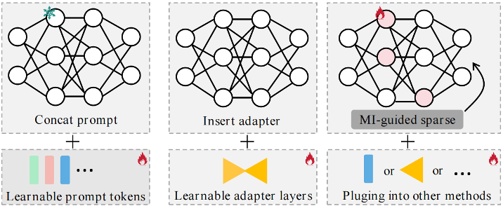 在预训练模型上进行持续学习为跨任务的高效适应提供了巨大潜力。然而,现有的大多数方法往往冻结预训练模型参数,并依赖于提示或适配器等辅助模块,从而限制了模型的可塑性。当面对显著的分布变化时,这种策略会导致泛化能力不足。尽管完全微调可以提高适应性,但它同时也可能破坏的预训练知识。本文提出了一种互信息引导的稀疏微调方法,该方法是一种即插即用的策略,通过互信息目标的敏感性选择性地更新少量PTM参数(少于5%)。MIST能够在保持泛化能力的同时实现有效的任务特定适应。为进一步减少任务间干扰,在微调过程中引入了强稀疏正则化机制,通过随机丢弃梯度,使每步更新的参数比例低于0.5%。在标准冻结式方法之前应用MIST,可以持续提升多种持续学习基线的性能。实验结果表明,将MIST集成到多种基线方法中均能显著提高性能。