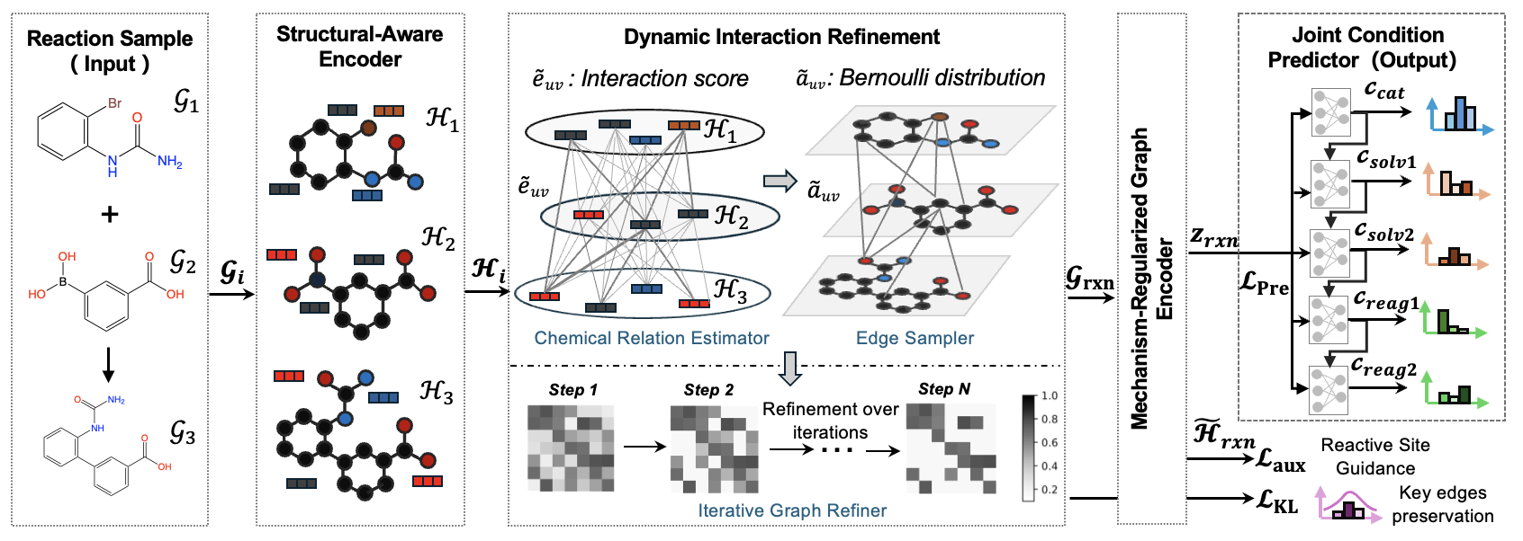 化学反应条件的精准预测(如催化剂、溶剂、试剂),是实现智能合成的关键。现有方法通常将反应物与产物独立编码,难以捕捉与条件相关的化学结构变化。为此,本研究提出变化感知的TRACE框架。该框架从原子层面联合建模反应物与产物,然后通过构建动态交互图来直接服务条件预测。其核心包含两大模块:结构感知编码器用于整合原子局部环境信息;动态交互优化模块则自适应推断关键分子间作用,并利用反应中心正则化聚焦化学活性区域。实验表明,TRACE在基准数据集上达到领先水平,尤其在溶剂与试剂预测中优势明显,并在时间迁移、少样本及真实合成场景中展现出卓越的泛化能力与稳健性,为其实际应用奠定了坚实基础。