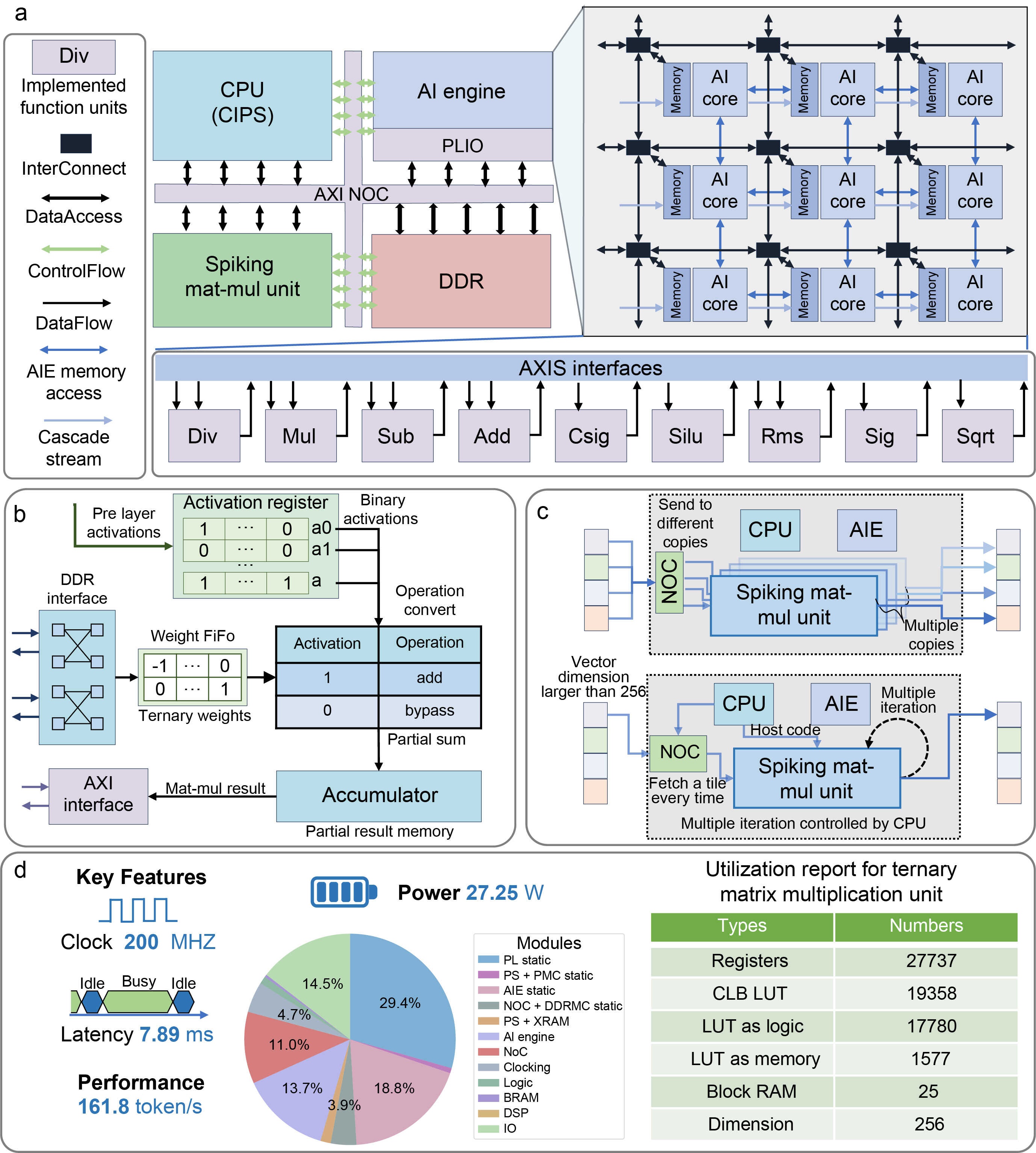 为验证能效,本研究在FPGA平台上定制了十亿参数量级的无矩阵乘法(MatMul-Free)计算架构。具体而言,研究团队通过逐层量化策略和层级灵敏度度量,评估层级对模型量化损失的影响,从而配置最优混合时间步脉冲模型,在低比特模型中实现了具有竞争力的性能;通过引入量化辅助稀疏策略,调整膜电位分布,下调量化映射概率,从而显著降低脉冲发放率,进一步提升模型效率。在VCK190 FPGA硬件平台上,该研究设计了MatMul-Free硬件核心,完全消除了NSLLM中的矩阵乘法操作,将动态功耗降至13.849W,吞吐量提升至161.8 token/s。与A800 GPU相比,该方法的能效、内存和推理吞吐量分别提高了19.8、21.3和2.2倍。
