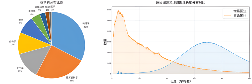 图1.学科分布以及原始图注和增强图注长度分布对比