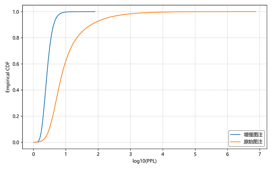 图2. 文本质量经验累积分布曲线。横坐标为log₁₀(pseudo-PPL),表示基于 SciBERT 掩码语言模型计算得到的文本困惑度水平;纵坐标为经验累积分布值。