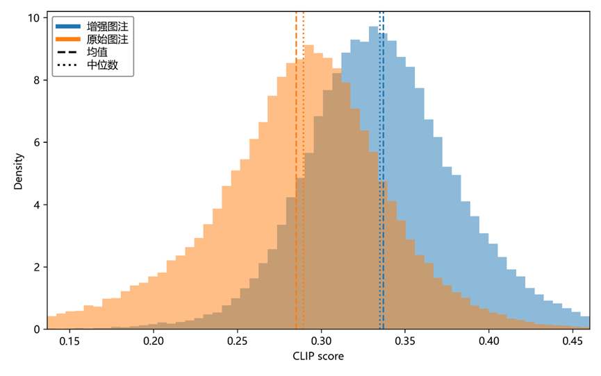 图3. CLIP图文一致性得分分布。横坐标为CLIP余弦相似度,纵坐标为概率密度。