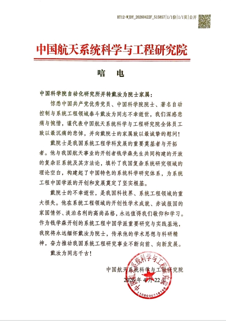 中国航天系统科学与工程研究院 唁电