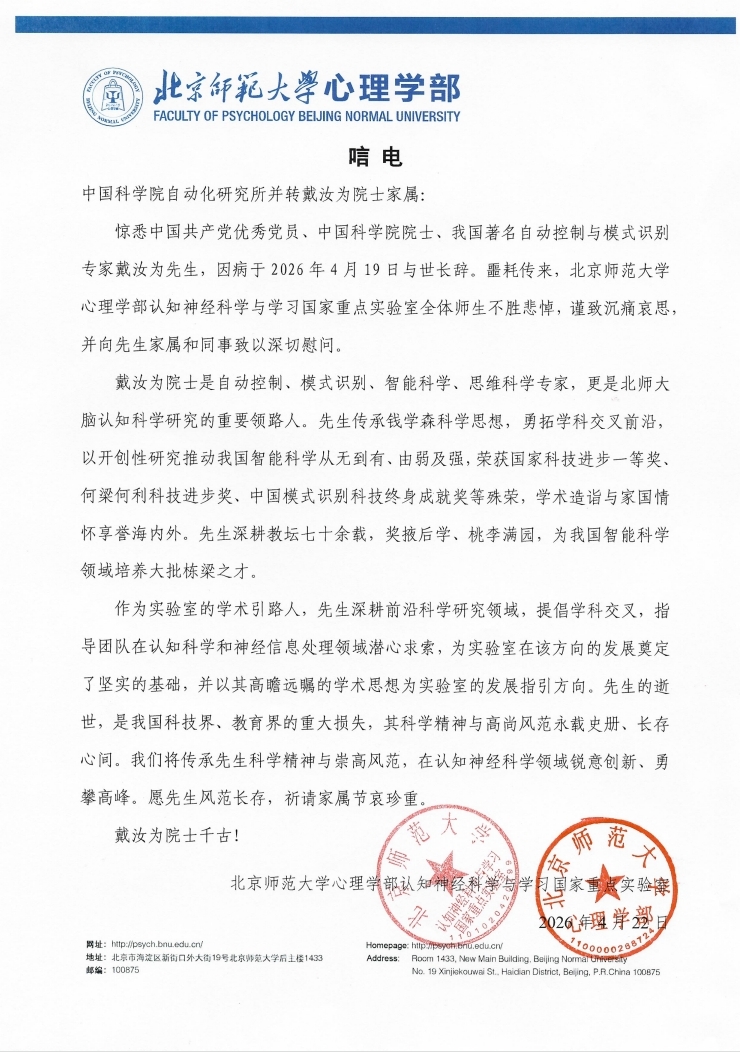 北京师范大学心理学部认知神经科学与学习国家重点实验室 唁电