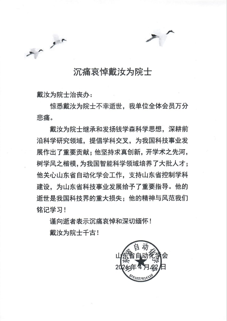 山东省自动化学会 唁电