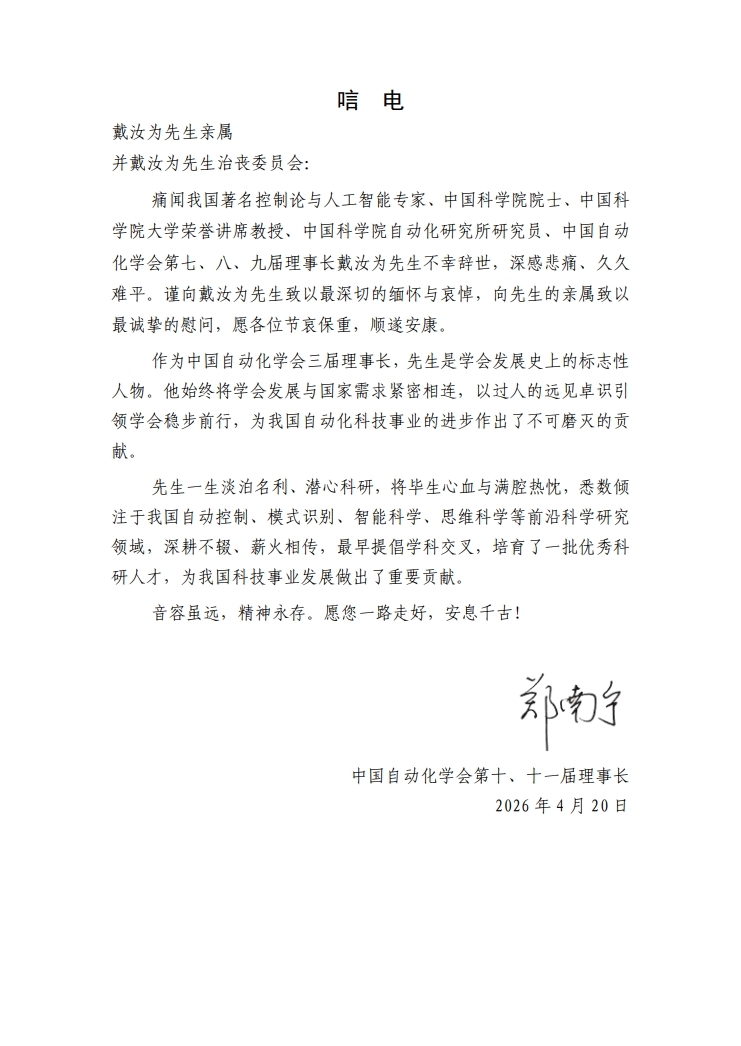 郑南宁 唁电