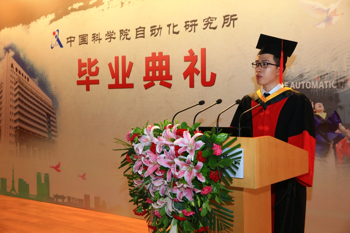 2013级硕博连读生王睿作为毕业生代表发言,他分享了在自动化所期间的成长经历与心路历程,比如在连续失败11次后终于实验成功的喜悦,项目验收前连夜奋战的艰辛,投稿第一篇SCI论文后等待审稿结果的忐忑,第一次在顶级会议上做完报告后的舒心。致辞最后,他代表毕业生们表达了对自动化所和老师们的感恩,祝愿自动化所硕果累累、老师们桃李天下、毕业生们前程似锦。