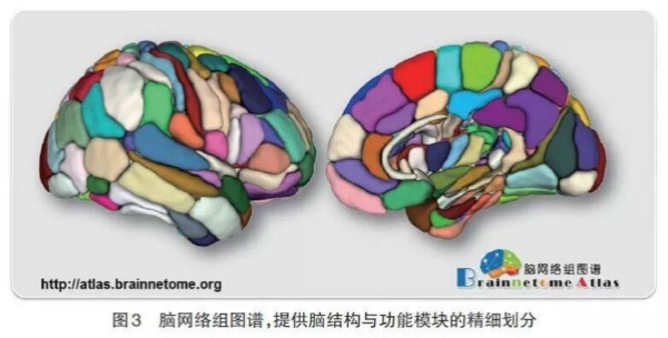 而AlphaGo 存在一个围棋盘面的估值网络和一个独立的走棋网络(虽然我们还不知道这是否是有意的类脑的设计,但这在原理上可能是类脑的划分),也说明了合适的模块化设计可能是其成功的一个重要因素。这些结果令人鼓舞,但我们对于大脑模块化设计的借鉴也许才刚刚开始。现在神经科学的研究正在为我们给出非常详尽的,包含数百个亚区的有关人脑的模块化分区图谱,包括每一个模块和其他模块之间的信息传递通路(图3)[9]。可以预见,这将对类脑信息处理算法的设计提供关键的启示。比如对于语言区的精细亚区划分及其功能的阐明,就可能对于语言处理算法的模块化设计提供有益的借鉴。有关类脑算法设计的第二个例子是我们可以向大脑学习如何调节网络的状态,从而灵活调控信息处理过程,使得系统能够适应不同的功能需求。