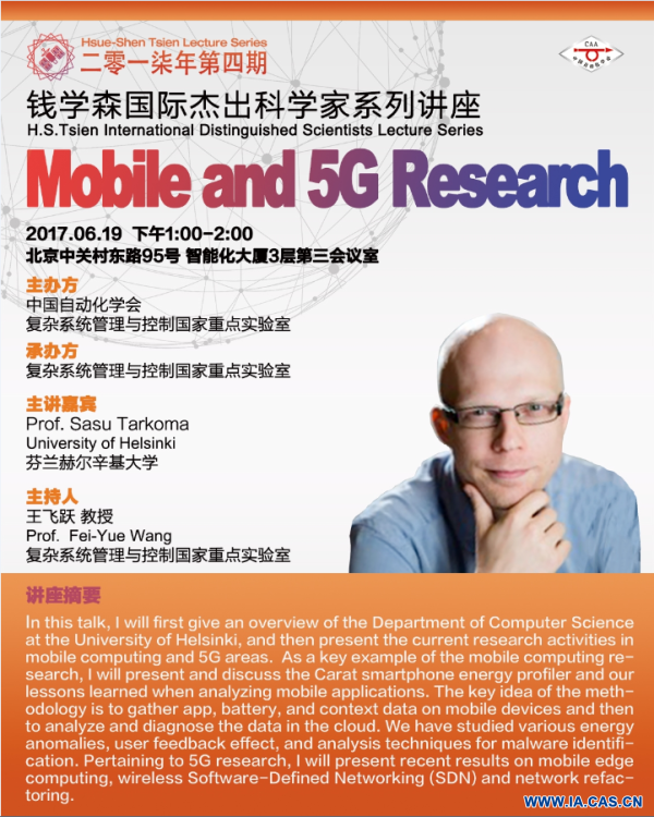 报告摘要:In this talk, I will first give an overview of the Department of Computer Science at the University of Helsinki, and then present the research activities in mobile computing and 5G areas. As a key example of the mobile computing research, I will present and discuss the Carat smartphone energy profiler and our lessons learned when analyzing mobile applications. The key idea of the methodology is to gather app, battery, and context data on mobile devices and then to analyze and diagnose the data in the cloud. We have studied various energy anomalies, user feedback effect, and analysis techniques for malware identification. Pertaining to 5G research, I will present recent results on mobile edge computing, wireless Software-Defined Networking (SDN) and network refactoring.
